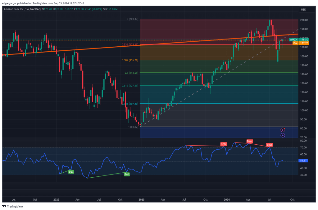 Amazon shows lower levels in the RSI in the latest move-up. It is now behind the pivot line from 2022 and having resistance there in the bounce from the 0.382 Fib level.